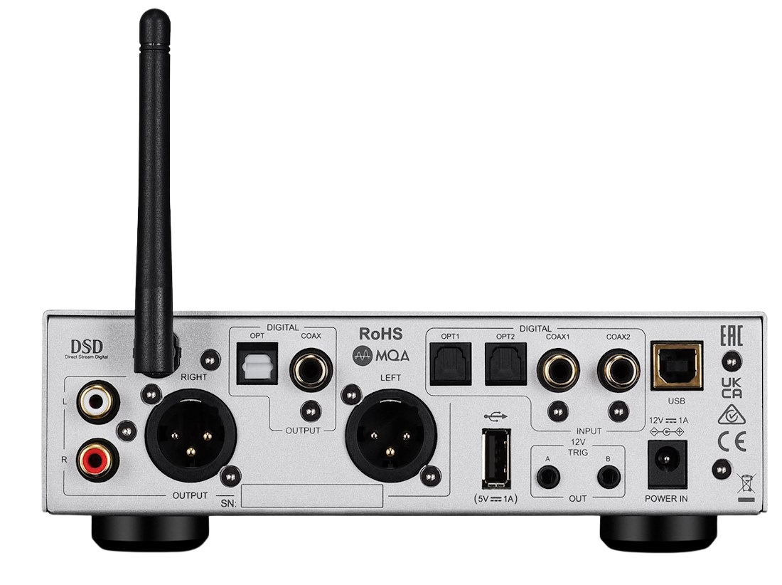 DAC-Chip: ESS ES9038Q2M, Unterstützte Formate: PCM bis 768 kHz/32 Bit, DSD bis DSD512, MQA (vollständig), Digitaleingänge: USB-B, USB-A, 2× Koax, 2× Toslink, Bluetooth 5.1, Ausgänge: RCA, XLR, Optisch, Koaxial, Kopfhörer (6,3 mm), Frequenzgang: 20 Hz – 20 kHz (±0,2 dB), Signal-Rausch-Abstand: >115 dB (RCA), >117 dB (XLR), Maße/Gewicht: 250 × 61 × 250 mm, 2,5 kg, in Schwarz oder silber lieferbar.