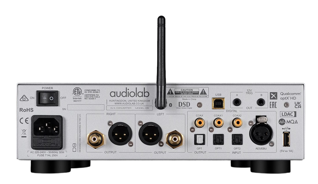 Der Audiolab D9 ist ein DAC der Referenzklasse mit ESS9038PRO-Chip. Er verarbeitet PCM bis 768 kHz/32 Bit und DSD512, inklusive vollständiger MQA-Dekodierung. Neben USB, AES/EBU, S/PDIF und Bluetooth 5.1 bietet er symmetrische und unsymmetrische Ausgänge sowie einen leistungsstarken Kopfhörerverstärker. Das Gerät ist mit einem hochauflösenden IPS-Farbdisplay ausgestattet.