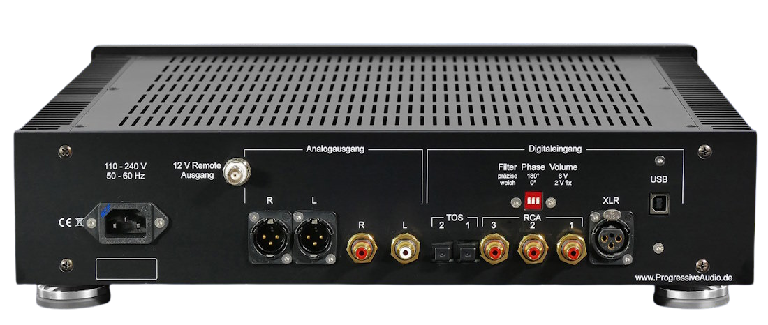 Digitaleingänge: 3× RCA, 1× XLR, 2× Toslink, USB, Unterstützte Formate: PCM 24 Bit/192 kHz, DSD bis 384 kHz, Analogausgänge: XLR, RCA, Stromausgangsstufe, Ausgangsspannung: bis 6 V oder fix 2 V, Frequenzgang: 1 Hz – 100 kHz, Lautstärkeregelung: 0–120 dB in 0,5-dB-Schritten, Maße/Gewicht: 365 × 95 × 230 mm, Betrieb 90–250 V AC