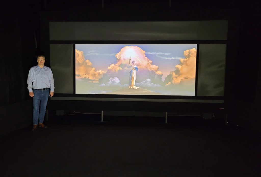 Allein über das Format der Leinwand könnte man viele Seiten schreiben: 1,78/1, 1,85/1, 2,0/1, 2,2/1, 2,4/1 oder sogar 2,76:1…Benötigt man eine Maskierung? In unserem Saal 2 zeigen wir eine 4,60m breite 4-fach maskierbare Leinwand im ungewöhnlichen 2,2/1 Format und können Ihnen so alle Varianten und Größen vor allem auch in Verbindung mit den Kombinationsmöglichkeiten eines Videoprozessors zeigen.